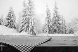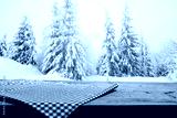 Empty wood flooring on blurred winter background. Empty space for Your object. Backdrop, table layout with winter landscape and snowflakes.