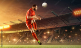 Soccer player in action on a field with the ball. Sports game. Soccer championship. Floodlit stadium