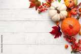 Festive autumn decor from pumpkins, berries and leaves on a white wooden background. Concept of Thanksgiving day or Halloween. Flat lay autumn composition with copy space.
