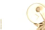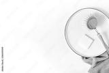 Natural wooden dish washing brush, soap and linen tea towel isolated on white table background. Plastic free cleaning tool, zero waste concept. Flat lay, top view. Sustainable, eco friendly cleaning.