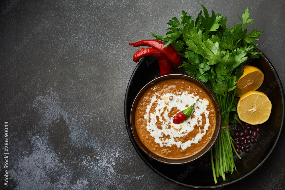 Dal Makhani at dark background. Dal Makhani - traditional indian cuisine puree dish with urad beans, red beans, butter, spices and cream. Copy space