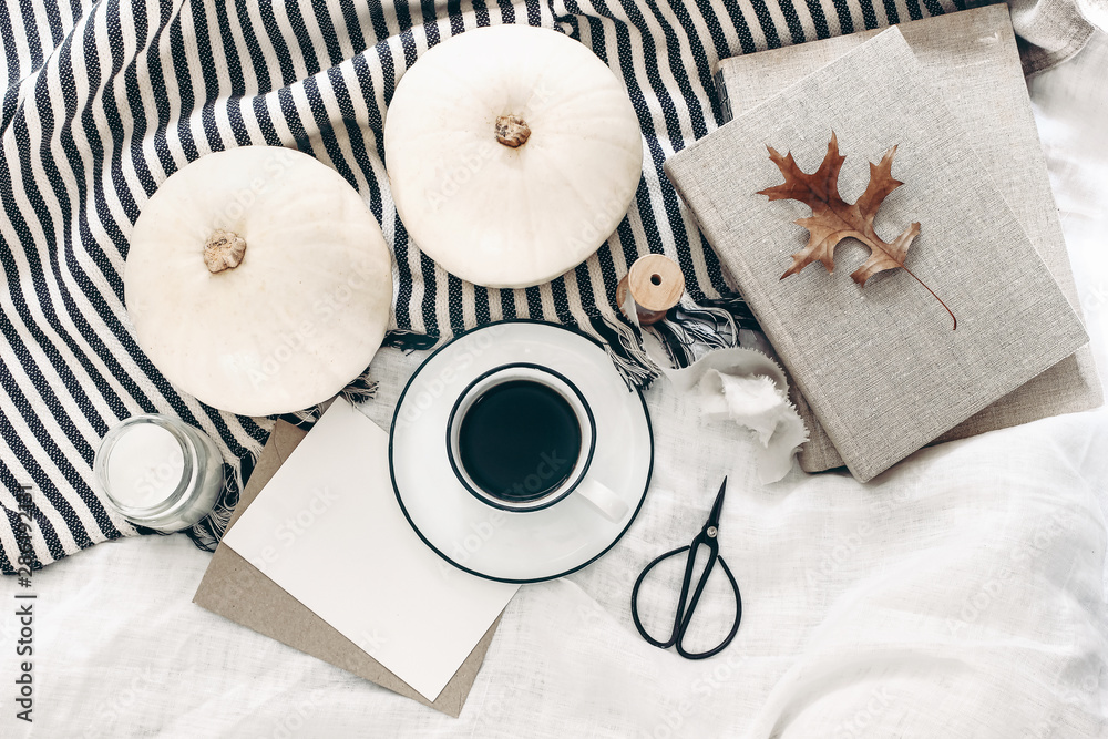 Blank greeting card mock-up. Autumn breakfast in bed composition. Cup of coffee, white pumpkins, plaid, oak leaves and old books. Linen background. Thanksgiving, Halloween. Flat lay. Top view.