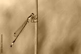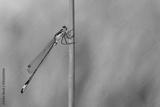 Closeup of a little dragonfly, in front of light background, sitting and waiting at a vertical stalk