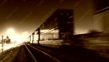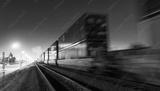 Night train locomotive in motion on railroad at night.