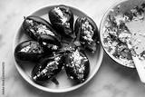 Baked eggplant on a white dish. Stuffed with Cheese and Greens