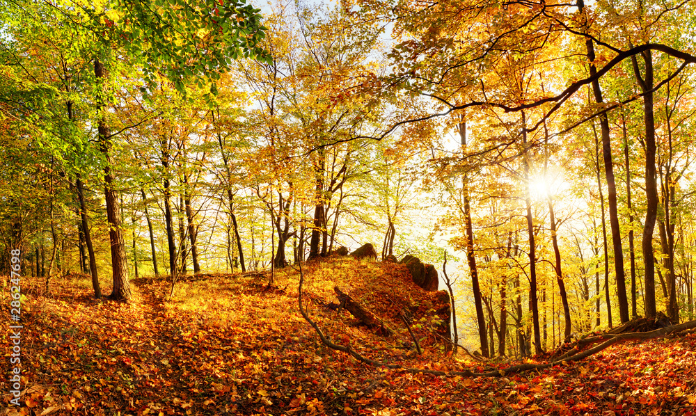 landcape with forest at autumn with sun