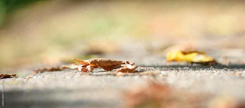 Yellow autumn leaves on the ground. Autumn natural background. Panorama