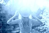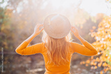 blonde in a yellow jacket on a background of autumn nature. the frame is lit by sunlight. A young woman in a gray hat looks at the autumn forest. Portrait of a woman in autumn