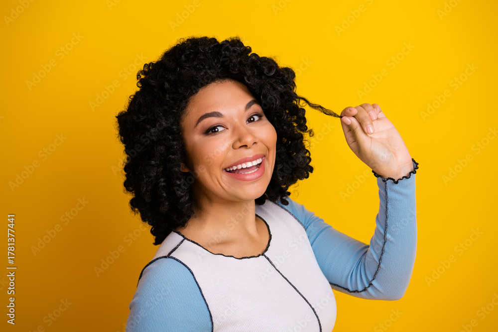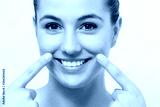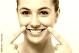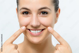 Attractive young woman showing pointing with fingers on sagging wrinkles on cheek.