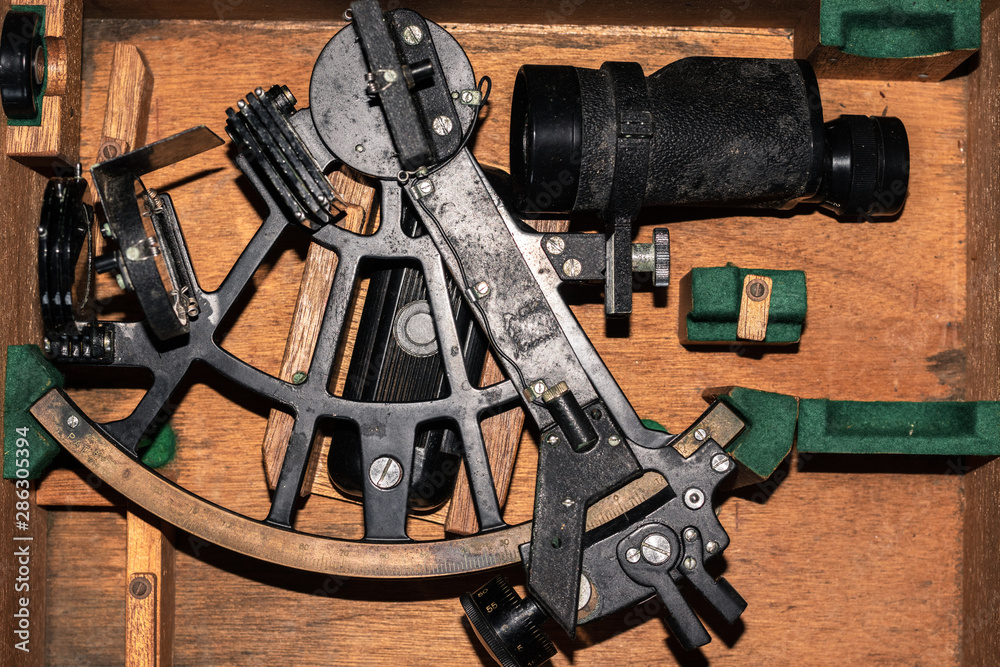 An old sextant laying down in a wooden case. Marine navigation and Columbus day concept.