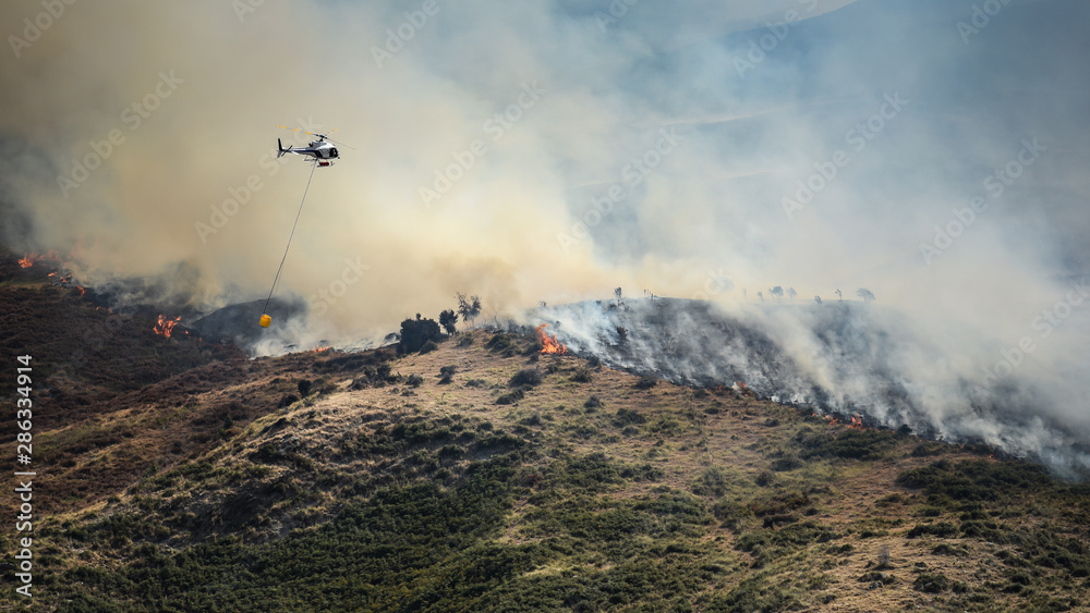 Firefighting helicopter with bucket drop water on forest fire or wildfire.