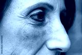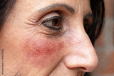Close up of woman face showing redness on cheeks caused by rosacea, couperose