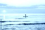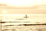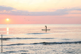 Woman's silhouette on a paddle board (SUP) at a beautiful pink pastel gradient sunset.