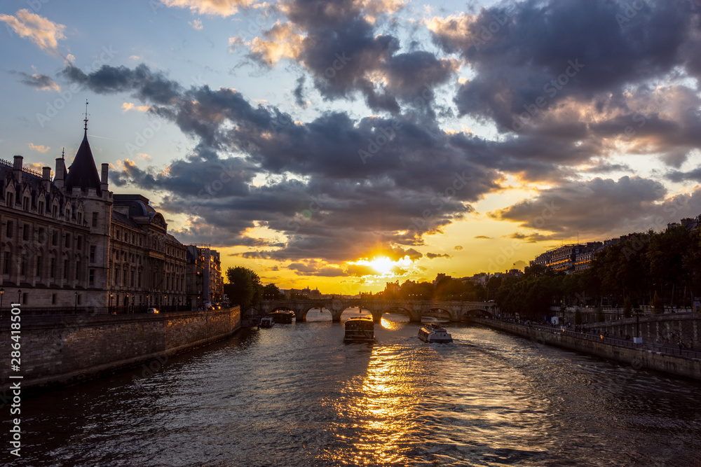 Sunset over Conciergerie and Pont Neuf bridge at Golden hour - Paris, France.