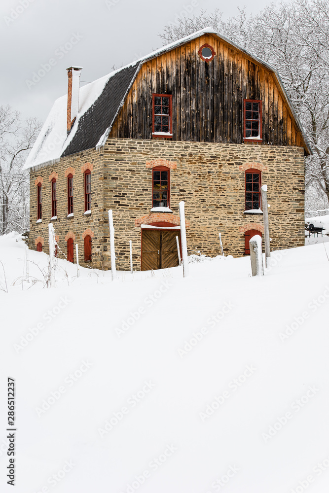 Historic, Rustic Stone Barn Surrounded by Deep Snow - Finger Lakes Region of New York