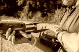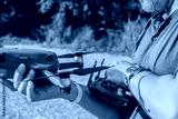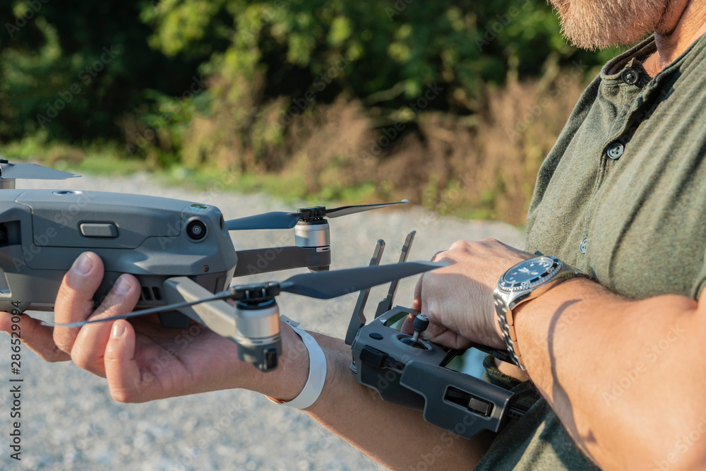 A man in one hand holding a drone, and in the other hand a bullet control of the drone. A fragment of a man's body is depicted. Selective focus. Copy space.
