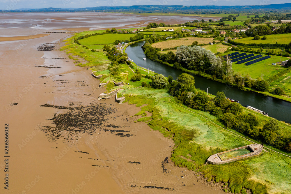 Aerial drone view of abandoned ships on the banks of the River Severn at Purton in England