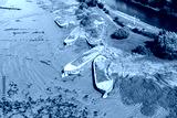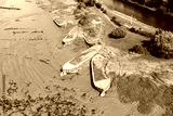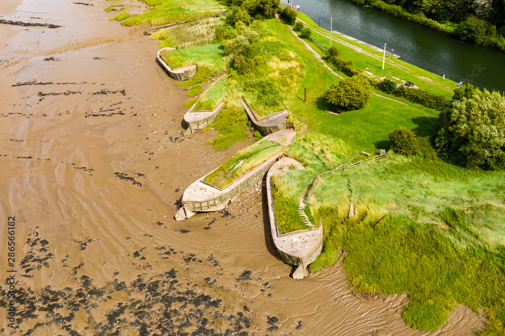 Aerial drone view of silt filled abandoned ships on the banks on a muddy river