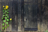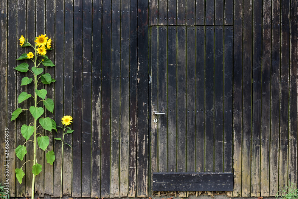 Background of vertical old brown weathered wooden slats and a closed wooden door in it, with a decorative sunflower in front of it