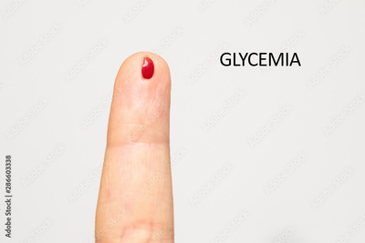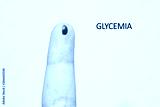 Blood drop on finger with white background and glycemia term, concept of blood tests