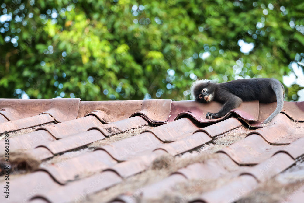 Dusky Spectacled Langur or leaf monkey lay on the roof