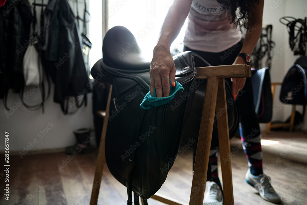 Cleaning and maintenance of the saddle. The woman rider cares for the saddle