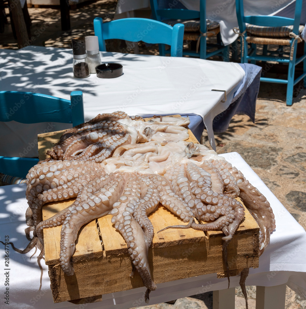 Crete, Greece. June 2019. A large octopus on a wooden box drying in the sun in a Cretan restaurant.
