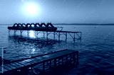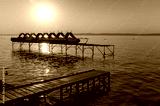 Travel background of pedal boats with piers over sunset at lake Balaton in Hungary