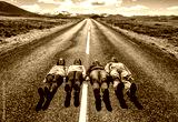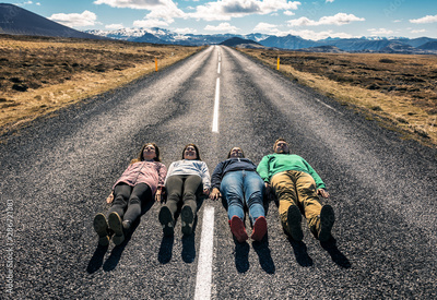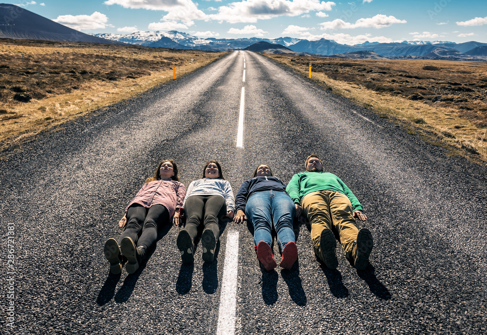 four friends lie down on the road