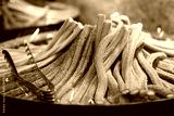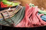 Sweet candy in the form of narrow colorful stripes. Candy sprinkled with sugar. Candy lie candy tongs. Selective focus.