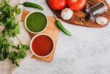mexican red and green sauces, spicy hot chili sauce made with chilli pepper, garlic and tomatoes, food in Mexico city