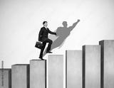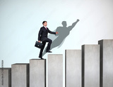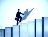 Businessman rise up on the career ladder with superhero shadow on the wall.