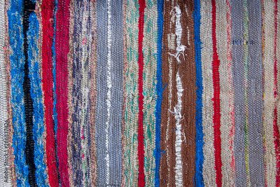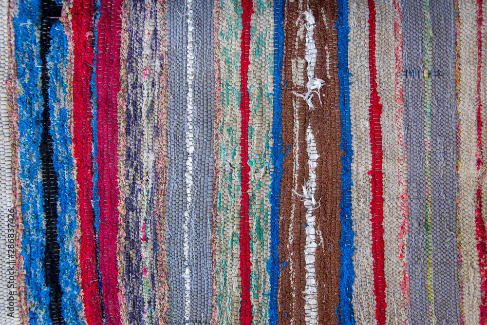 Traditional Ukrainian ornament with carpet, self-sewed pattern on linen fabric, multicolored, variegated stripes, backgrounds and textures