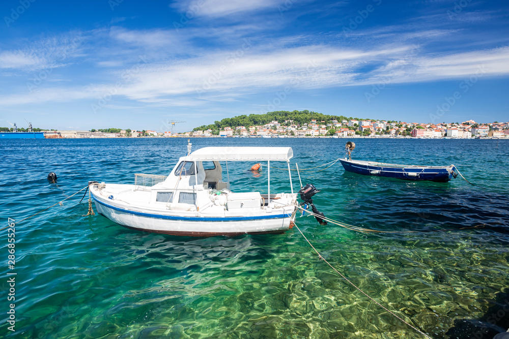 boot moored at the wooden pier in harbour of Losinj town, Croatia.