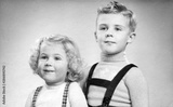 Early 1950s duo portrait of a young boy and girl with blond hair and curls.