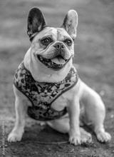 Pied French Bulldog Female Portrait. Off-leash Dog Park in Northern California.