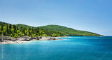 Scenic view of the forest across the beautiful Blue water of Lake Superior at Neys Provincial Park, Ontario, Canada