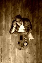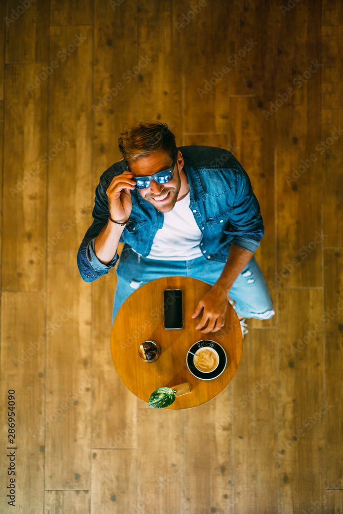 Attractive man with mobile phone at restaurant table