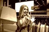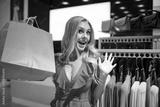 Surprise photo of young cute shopping woman in boutique