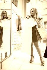 Chic blonde woman in pink trying on a lovely white transparent dress in front of mirror