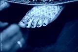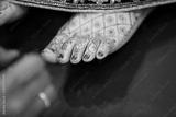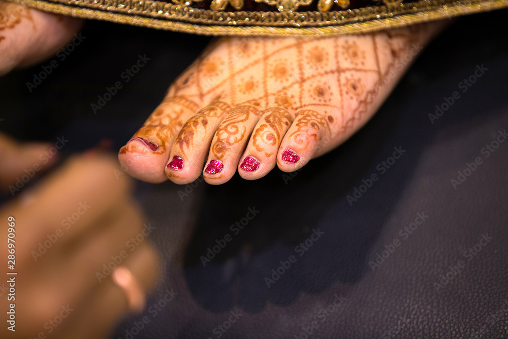 Indian bride feet coloring with indian henna paste or mehndi design of symbolic tattoos during a Hindu wedding ceremony - Image
