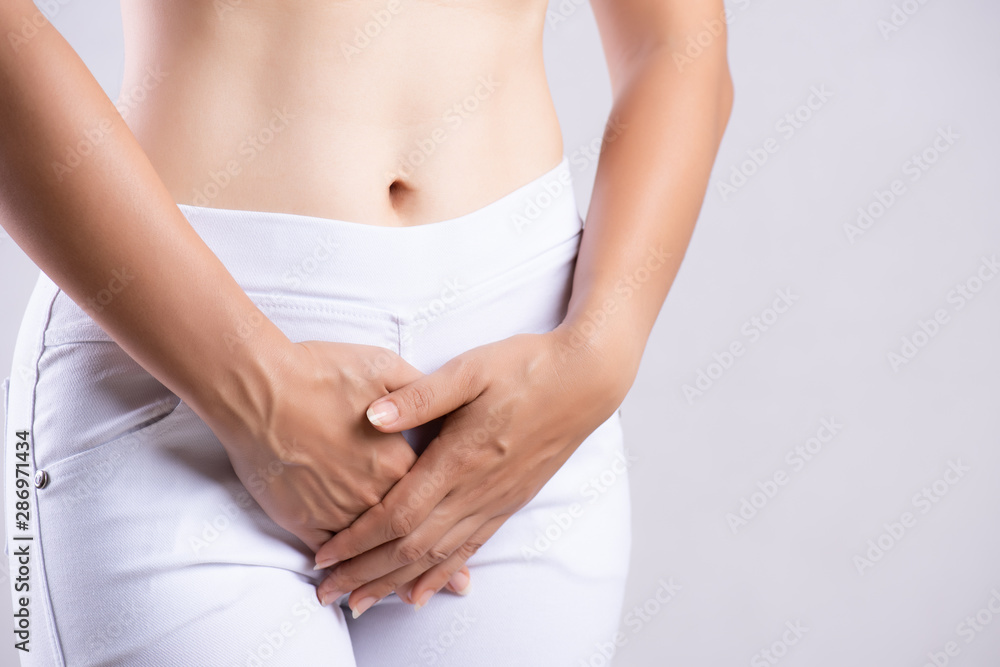 Young woman having painful stomachache with hands holding pressing her crotch lower abdomen. Medical or gynecological problems, healthcare concept