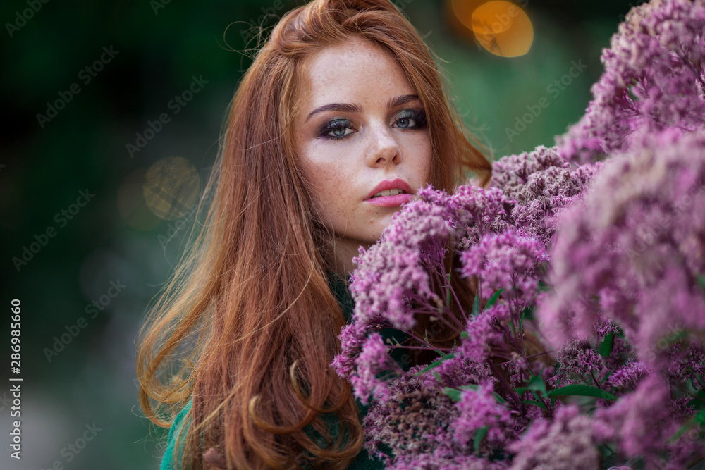 Sunshine young smiling woman with red curly hair is wearing green sweater and hat in autumn park near purple bush of flowers.