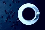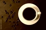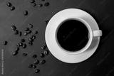 Black coffee, Americano coffee in a white cup with coffee beans on black background.