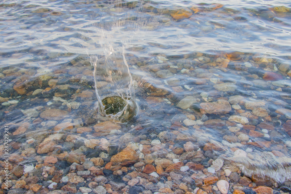 Small colored stones can be seen through clear water. There's a splash from rock thrown into water.