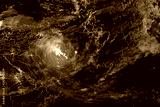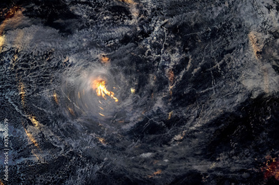 Hurricane at night over land burning in fires. Elements of this image furnished by NASA.