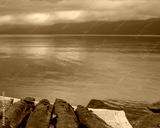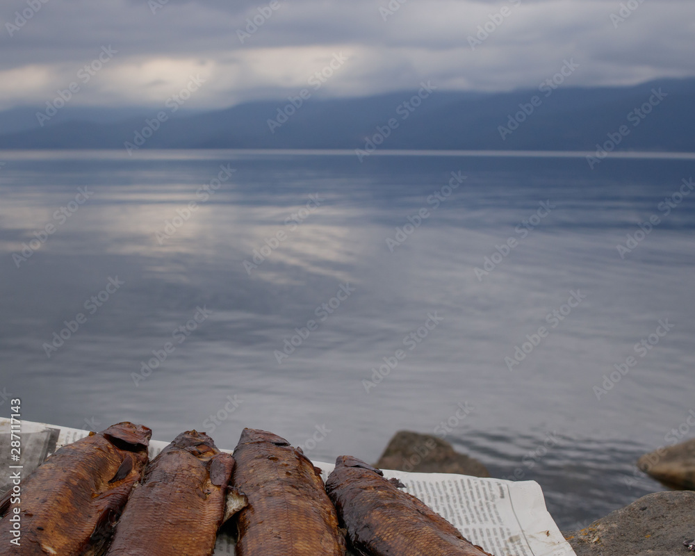 4 hot smoked fish lying on a newspaper on the background of Lake Baikal.