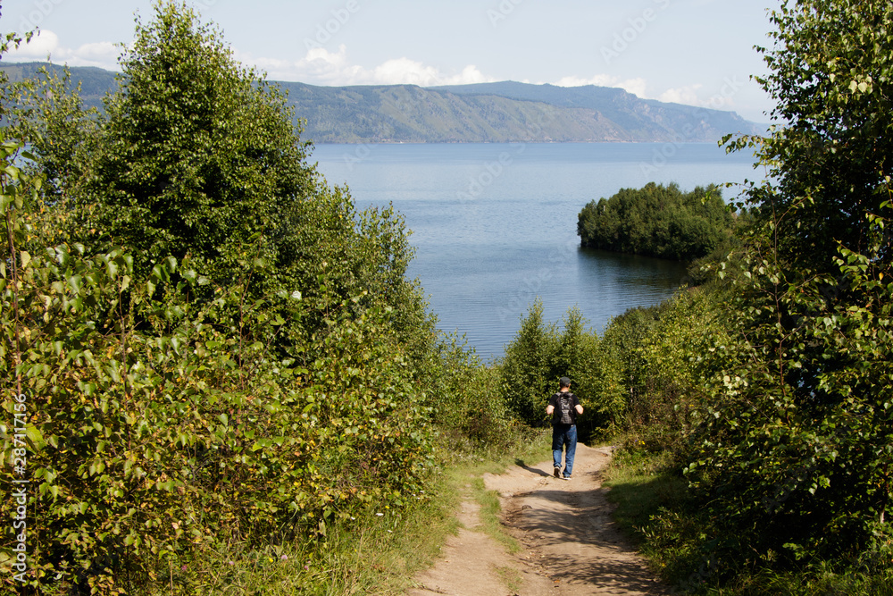 A tourist walking along path leading to Shaman Peninsula. Lake Baikal near city of Slyudyanka