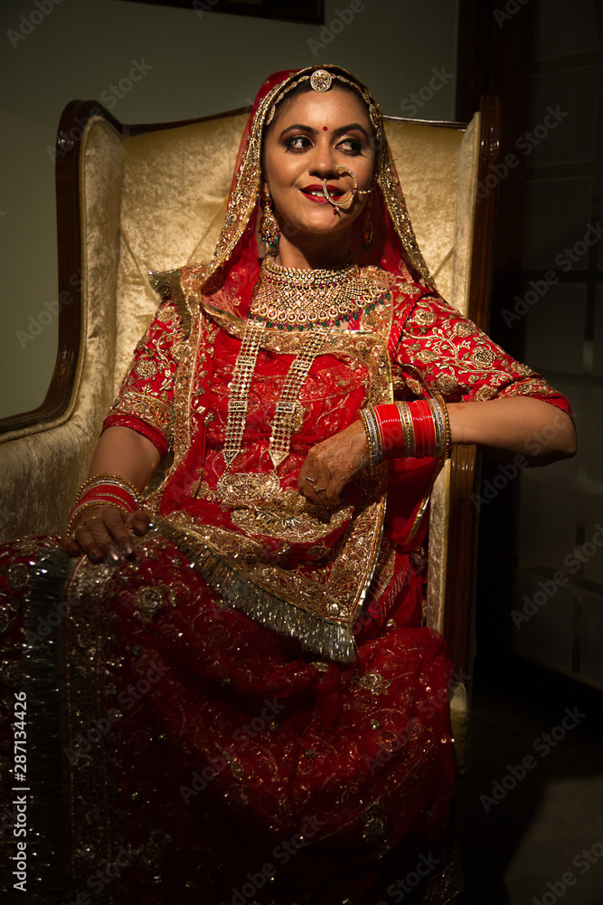 Beautiful pretty traditional Indian girl sitting on sofa wearing ethnic bridal outfit with heavy makeup and gold jewelery, indian bride portrait - Image