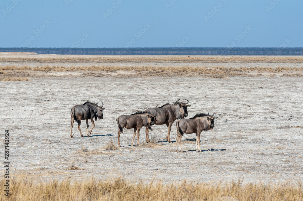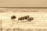 A herd of Blue Wildebeest -Connochaetes taurinus- also known as Gnus, heading out onto the salt pans of Etosha National Park, Namibia.